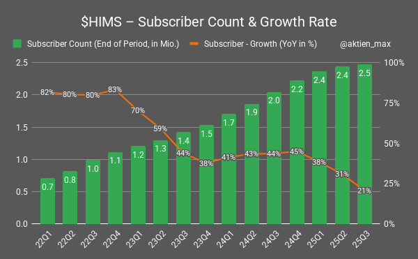 Hims gewinnt deutlich weniger neue Abos hinzu. Netto kamen im 3. Quartal nur 32.000 dazu (von 2,439 Mio. auf 2,471 Mio.).