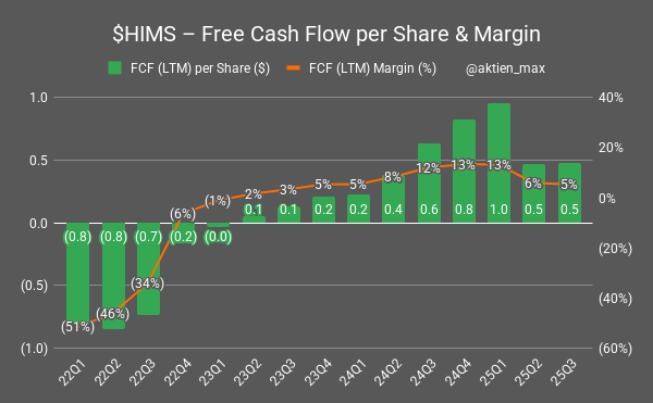 In den letzten 12 Monaten (Last Twelve Months, LTM) lag der FCF pro Aktie bei Hims bei rund $0,5 (Q3-2025) und ist damit 50% niedriger als noch in Q1-2025.