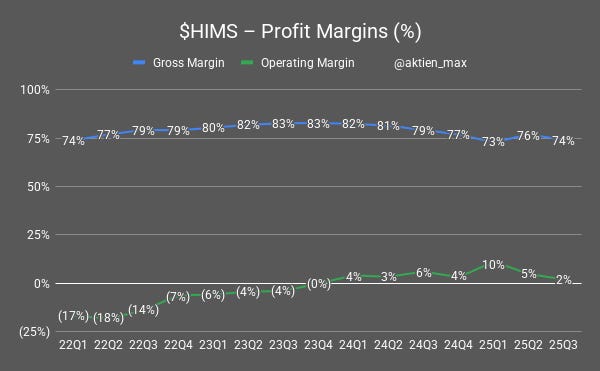 Hier wird erkennbar, dass Hims (wie bereits erwähnt) weiterhin stark in Wachstum investiert, um 2025 ein Umsatzwachstum von knapp 60% zu erreichen. Dass Hims bei diesen hohen Umsatzwachstumsraten auf Ganzjahressicht überhaupt einen positiven FCF erreicht, ist sehr gut.