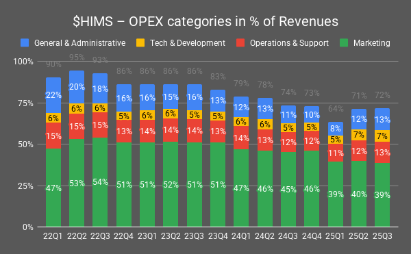 Positiv ist hier ganz klar, dass die Marketingkosten 🟩 im Verhältnis zum Umsatz von 45% auf 39% abgenommen haben. Das bedeutet zwar weniger Kosten, allerdings hat Hims wie erwähnt auch weniger Net New Subscribers anziehen können, wobei die Kundenqualität, wie erwähnt, wahrscheinlich gestiegen ist.