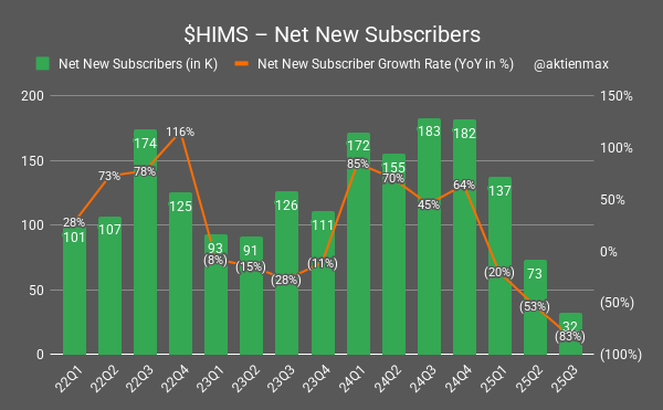 Hims selbst begründet die sinkenden Net New Subscribers im Q3-2025 Earnings Call anhand der anhaltenden Übergangsphase bei Sexual-Health-Produkten. Ohne diese Einflüsse hätte die Zunahme der Abonnentenanzahl bei über 40% gelegen statt 21%: